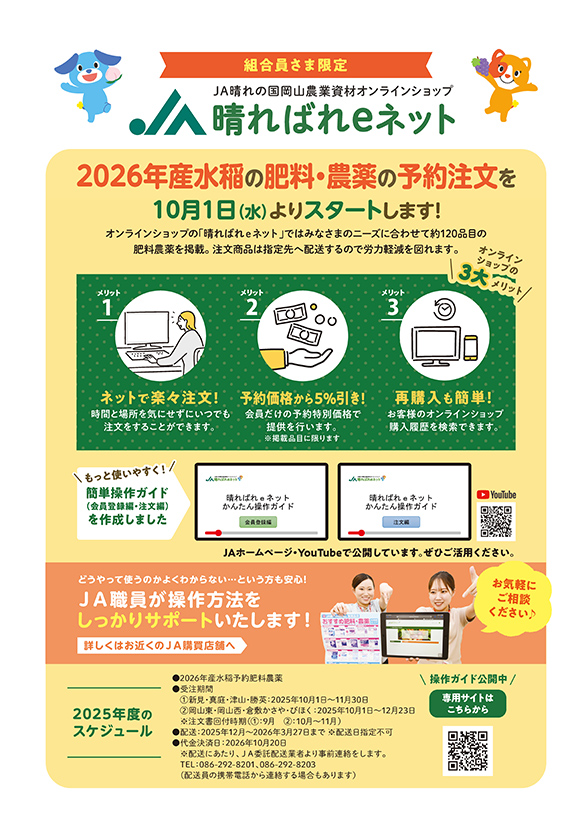 JA晴れの国岡山は、水稲の予約肥料農薬の注文をWEBで受付ける組合員向け注文サイトを開設しました。ご利用を希望される組合員の方は下記より登録手続きをお願いします。