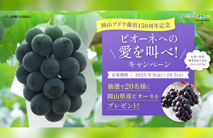 ブドウ栽培150周年記念「ピオーネへの愛を叫べ!キャンペーン」(キャンペーンは終了しました)Instagramの投稿に、甘くてジューシーなピオーネの“好きなところ”をコメントで教えてください。抽選で20人の方に「岡山県産ピオーネ」をプレゼント! |