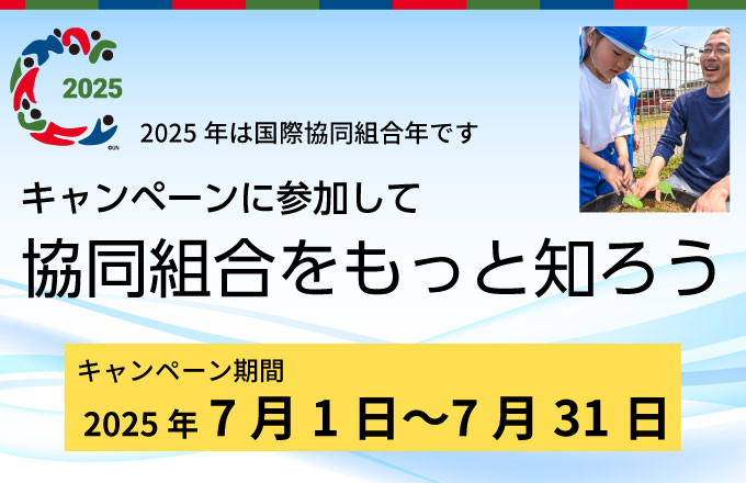 キャンペーンに参加して協同組合をもっと知ろう(キャンペーンは終了しました)2025年は国際協同組合年!協同組合のことを知って、実践して、みんなで協同の輪を広げるキャンペーンです! |