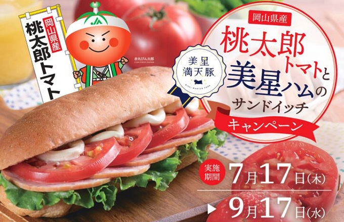 桃太郎トマトと美星ハムのサンドイッチキャンペーン(キャンペーンは終了しました)応募シールを集めて抽選で素敵な農畜産物を当てよう!今年度も、おかやまキムラヤとのコラボ企画「桃太郎トマトと美星ハムを使ったサンドイッチ」を7月17日(木)から発売します。発売に伴い、例年同様キャンペーンも展開しますので、ぜひこの機会にご賞味ください。 |