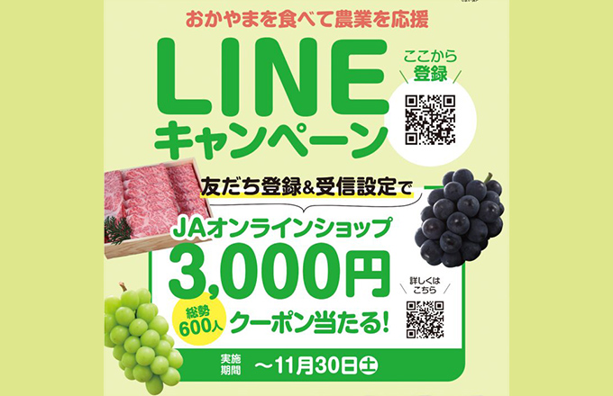 LINE友だち登録でJAオンラインショップで使えるクーポンが当たる!(キャンペーンは終了しました)LINE友だち登録をしてくださった方に、JAオンラインショップで使えるクーポンが総勢600人に当たるキャンペーンを実施します。 |
