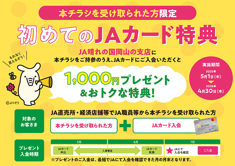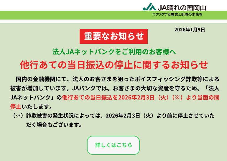 JA晴れの国岡山 本店 信用部 〒713-8113 岡山県倉敷市玉島八島1510-1 TEL 086-476-1834 |