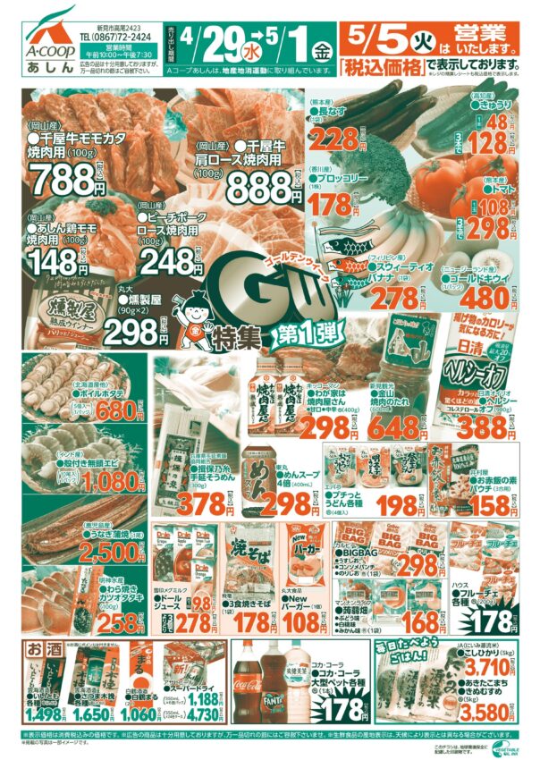 4月29日(金)からゴールデンウイーク第1弾特集!焼肉のたれ、そうめん、ジュースなどを特価で。