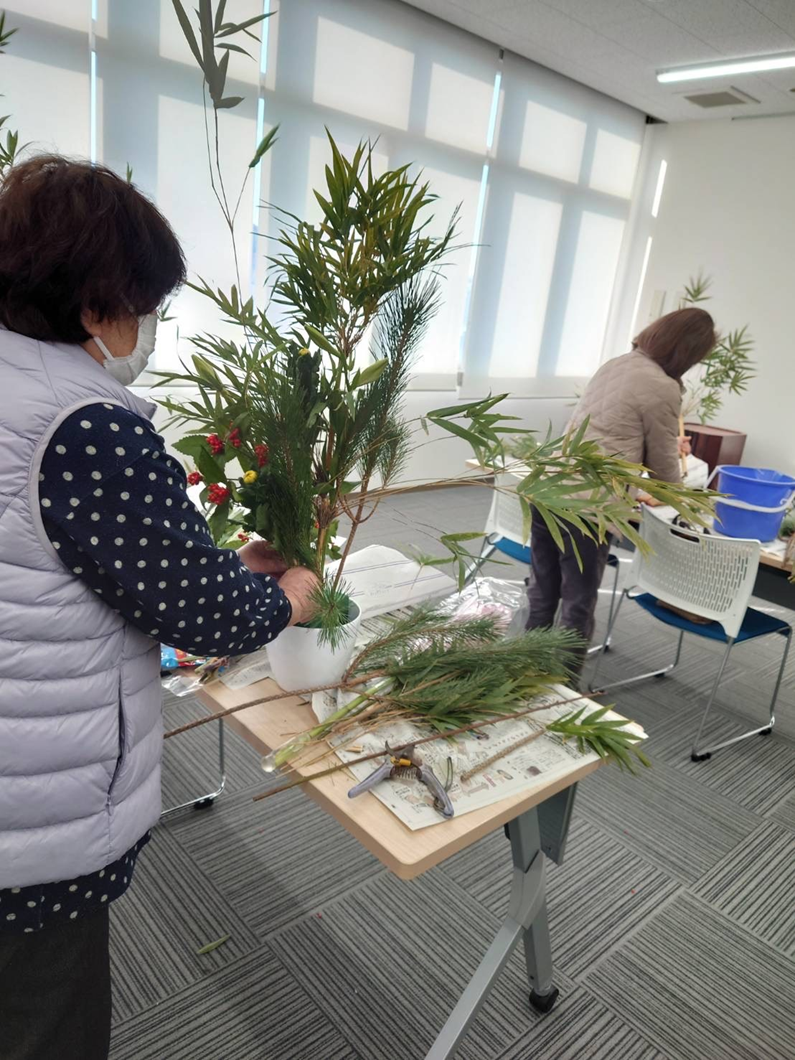 華道の先生を講師に招き、お正月をテーマに松、菊、ハボタンなどを丁寧に鉢に挿しました。部員は色が偏らないように試行錯誤しながら思い思いの作品に仕上げました。完成後は部員同士で披露し合って楽しみました。参加した部員は「自宅に飾って、家族で楽しい年末年始を過ごしたい」と話しました。