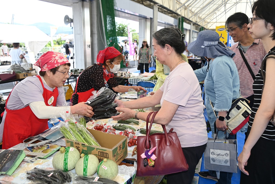 同会は、メンバーが栽培する特産のアルストロメリアやリンドウを使ったアレンジメントのワークショップを開催。鮮度の良い花をたくさん使って自由に生けられ、幅広い年代の来場者が体験を楽しみました。パッションフルーツやミニトマト、ナスなど、季節の農産物も人気でした。