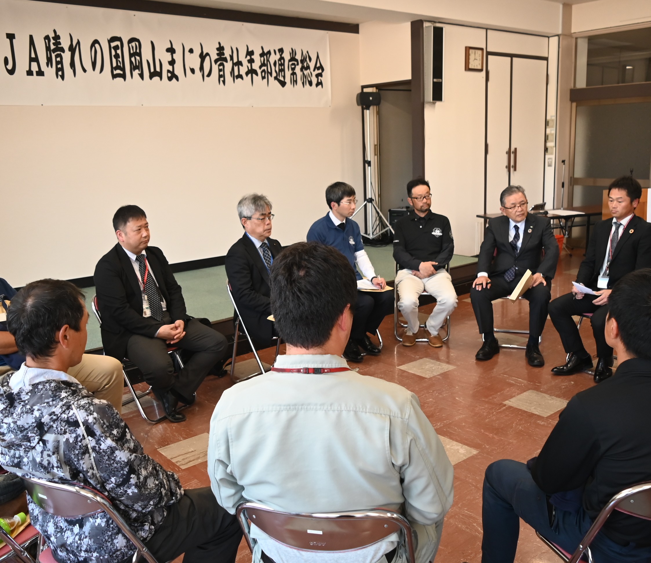 JA晴れの国岡山まにわ青壮年部では4月下旬、真庭市で総会を開き、部員とJA役職員が意見を交換しました。