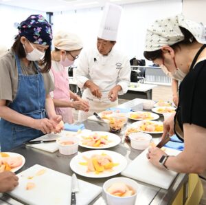 この企画は「くだもの王国おかやま」の代表格であるモモとブドウの産地であることをいかし、果物をスイーツとして提供するプロから五感を通じて、県産の果物の魅力に触れ、特産品や農業に対する理解醸成を目指そうと企画。講師に、創立140周年を迎える老舗果実専門店「タカノフルーツパーラー」から森山登美男フルーツクチュリエ顧問らを招き、開催しました。