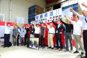 9月11日に開いた出荷進発式では生産者らが出荷状況などを確認し、取り遅れないよう気を引き締めました。少雨の影響で小粒傾向というものの、盆以降の夜温の低下によって色づきが進み、非常に甘く仕上がりました。出荷量1100㌧、販売額15億5100万円の目標達成へ、頑張ろうコールで巻き返しを誓いました。植田正二部会長は「昨年の反省を生かして出荷ロスをなくし、市場や消費者にしっかり届けていこう」と鼓舞しました。