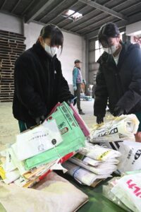 納入された廃棄プラスチックを積む学生