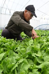 まにわ落合野菜生産組合春菊部会の太田春彦部会長(71)は、1.4㌃のハウスで大葉シュンギクを栽培。9月には種し、10月にハウス内に植え付けました。暑さなどの影響で病害虫被害が発生して品質が落ち着かず出荷が遅れ、気温が下がった12月に入って本格的な出荷となりました。