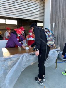 マラソン大会に出場する選手が温まるように地元食材を使って約1500人分の豚汁を作りました。出来たての豚汁は好評でした。参加者は「具だくさんでとてもおいしかった、体が温まる」と笑顔で話しました。参加した部員は「寒い中、多くの参加者に喜んでもらえたので心を込めて作ったかいがあった」と喜びを表しました。
