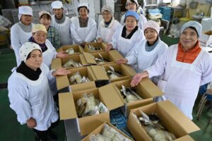 2024年は餅や菓子など8品が入った「いきいきセット・冬」、約390個を発送しました。「嫁いだ娘に」「お世話になった人に」と市内外に送られます。