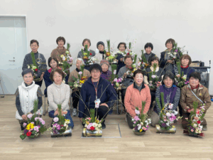 直売所に花を卸している花店の担当者を講師として招き、松、キク、ハボタンなどの好みの花や素材を選び、配置を考え、個性あふれる作品が完成しました。同ブロックの部長は「JAの指導員による女性部員向けの花農業塾に参加して栽培したハボタンを使い、個性あふれる作品ができてよかった」と話しました。