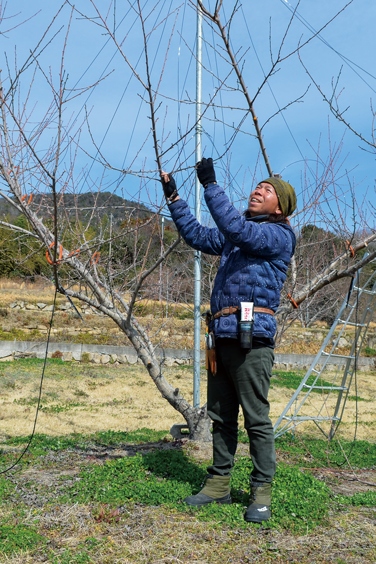 モモ栽培は春から夏の袋掛けや収穫に注目が集まりがちですが、冬のせん定や蕾を間引く摘蕾などが「実り」を左右し、木の生育にとても重要な作業だと実感します。実がつく様子をしっかり想像しながら、一枝一枝を丁寧に管理しています。近年の不安定な天候に栽培の難しさを感じつつも、先輩らと情報共有し安定生産に努めています。
