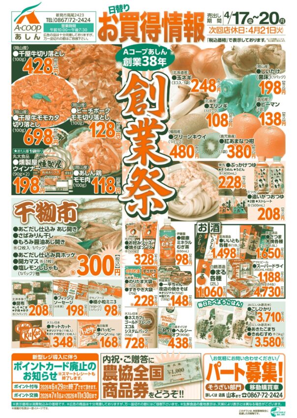 4月17日(金)からAコープあしん38年の創業祭!鮮魚、精肉、惣菜。青果の目玉企画が目白押し。日ごろの感謝の気持ちを込めて…。
