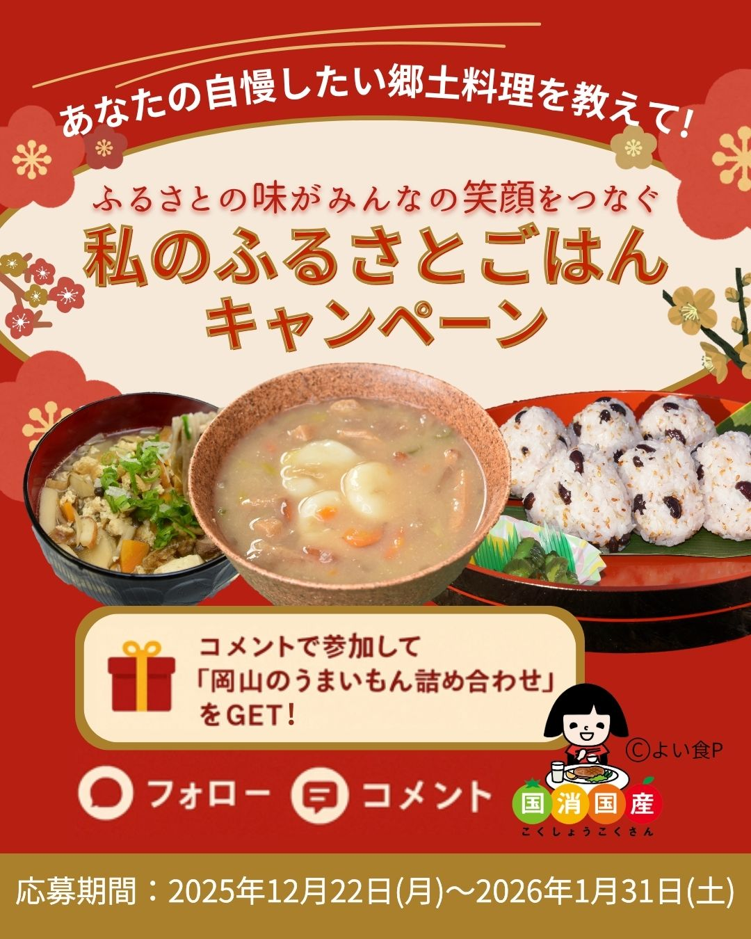 JA晴れの国岡山Instagramアカウントの該当投稿に「あなたの自慢したい郷土料理」や「年末年始に食べたいふるさとの味」をコメント!