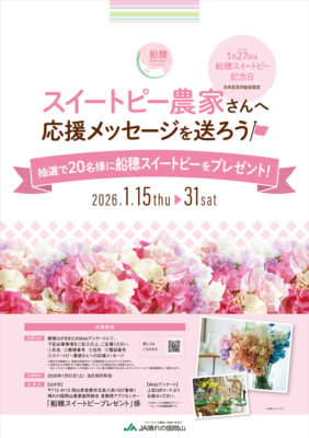 1月27日は、1(い〜)27(ふなお)ということで、「船穂スイートピー記念日」(日本記念日協会認定)です。また、1月21日は「スイートピーの日」でもあります。 スイートピー最盛期のこの時期に、たくさんの方々にスイートピーを楽しんでいただくため、「スイートピー農家さんへ応援メッセージを送ろう!」キャンペーンを開催します。