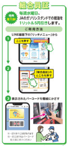当JAの組合員の方を対象に、LINE公式アカウントの組合員証を提示いただくと、JAの給油所で「給油5円/L引き(毎週水曜日)」特典をご利用いただけます。友だち登録がお済みでない組合員の方、まだ組合員ではない方は、この機会にぜひご登録や組合員加入をお願いします。