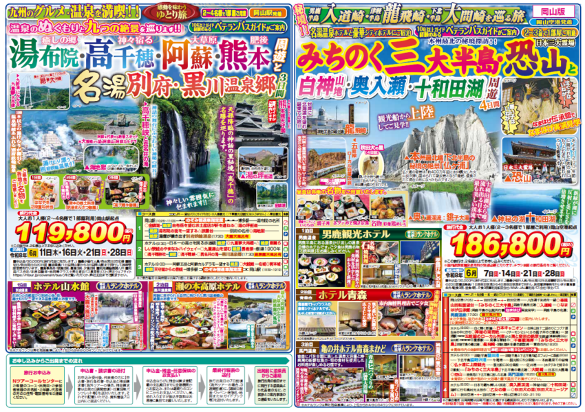 ≫湯布院・高千穂周遊と黒川温泉郷3日間、みちのく三大半島と十和田湖周遊4日間チラシ↓↓↓