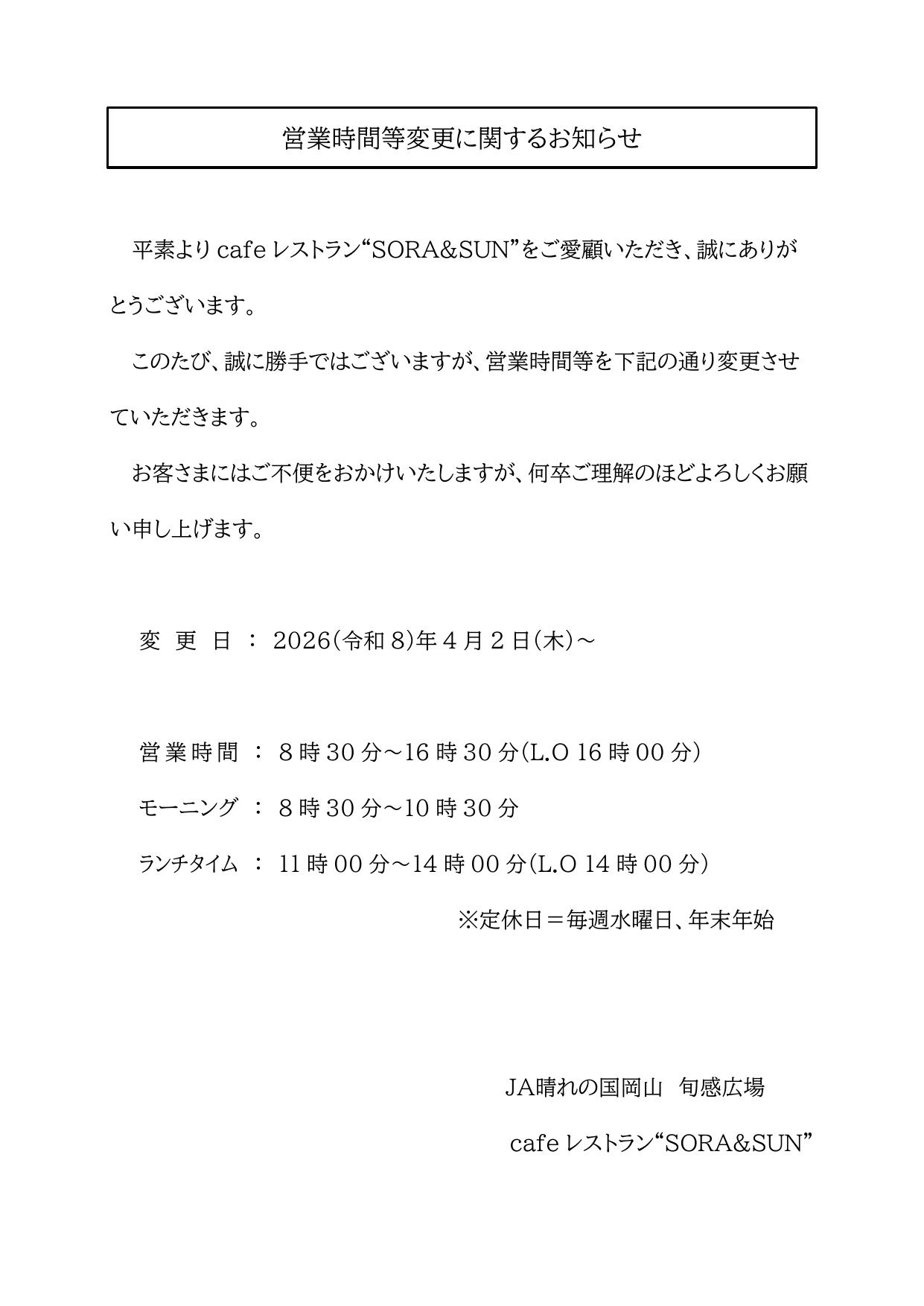 平素よりcafeレストラン”SORA&SUN”をご愛顧いただきありがとうございます。