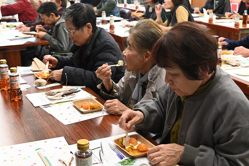 参加者は国産の米ぬかを100%原料に使うエーコープの「こめ油」を使ったスープやデザートなどを試食しながら講演を聞きました。参加者は「改めて食品の添加物に注意したいと思った。口にしたものが体と思考に直接影響することがよく分かった」と感想を述べました。