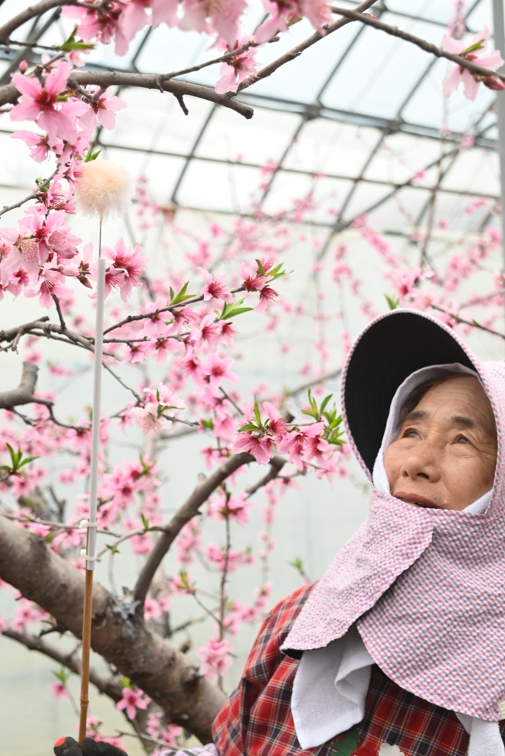 県内で唯一、加温栽培で桃を栽培する、勝央町桃部会の石川博之さん(49)、里江さん(72)親子のハウスで授粉作業が始まっています。桃の節句の3月3日、20度前後に保たれたハウスの中は一面ピンク色の花が咲き誇り、専用の器具を使って、おしべの花粉をめしべに付ける作業に追われていました。