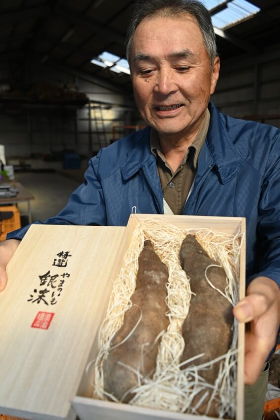 真庭市特産のヤマノイモ「銀沫(ぎんしぶき)」に付加価値を付けてブランド価値を高めようと、本年度から桐箱入りの「特選」の販売を始めます。