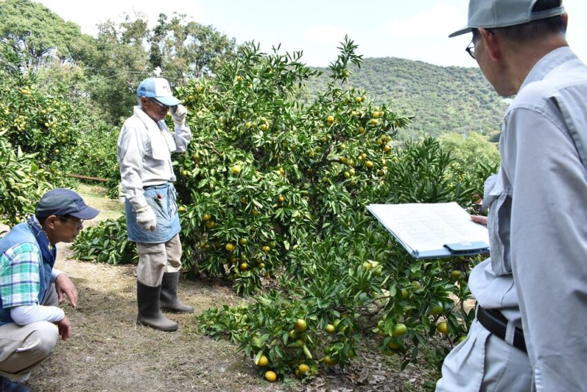 10月中旬には、日生町みかん生産組合が作柄調査を実施。JAや東備農業普及指導センターの6人が組合員の7園地を巡回し、生育状況を確認しました。