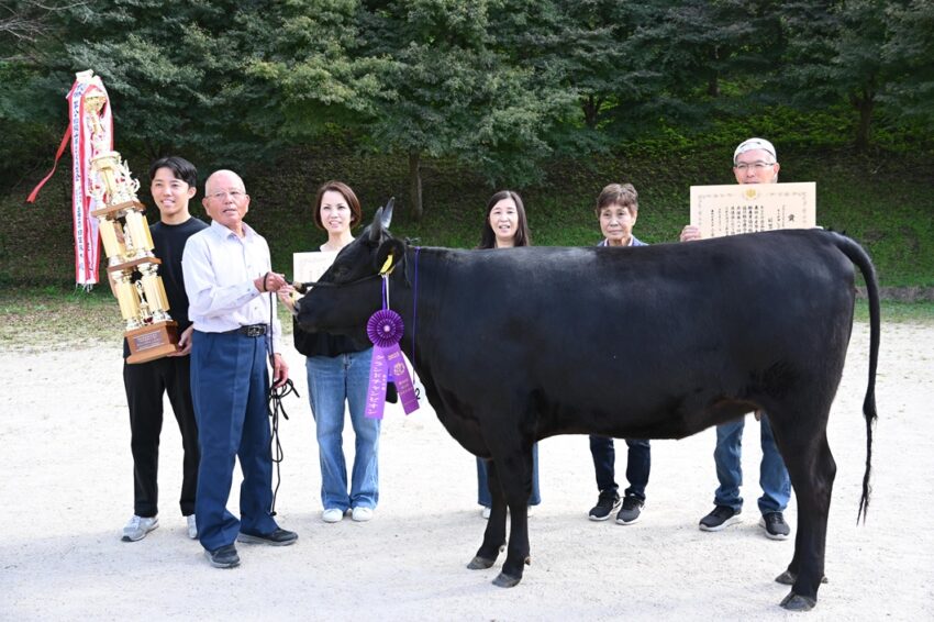 発育のよさや資質など改良の成果を競います。6つの区で審査に臨み、各区の首席の中からグランドチャンピオンの農林水産大臣賞に日笠敬太さん(吉備中央町)の「しんさくら751(若雌区の4)」、次席のリザーブチャンピオンの中国四国農政局長賞に築山健さん(鏡野町)の「のぼるつき・のぼるふじ・のぼるてん(繁殖牛群区)」が輝きました。