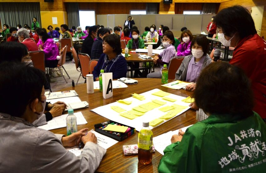 女性部は11月上旬、加賀郡吉備中央町で女性リーダー研修もかねたテーマで交流集会を開き、防災についてお互いの経験や取り組みを話し合いました。今年は特に豪雨や台風、地震など自然災害への不安感が高まるなか、災害時に女性部の絆が必要になるとして、地域の女性リーダーとして防災意識を高め、さらにリーダー同士の交流を深め、その力を地域で発揮することを目的に開催。管内各地から女性部員約120人とJA役職員が参加しました。三吉孝美副部長は「女性リーダーとして、今回の集会で得た知識を各地域で反映してほしい」と挨拶。防災士・管理栄養士として活躍する今泉マユ子さんを講師に招き「普段も災害時も役立つ防災クッキング&お湯ポチャレシピ」と題した講演で、防災食品や備品管理について見直し、一人ひとりに合った防災グッズを備える機会となりました。参加者らは熱心に講演を聞き、ポリ袋調理の利点や電気ポットで簡単に作る方法として「お湯ポチャレシピ」を学び、災害時に役立つ知識を身につけました。また、女性部役員が新聞紙で作るスリッパや段ボールで作る簡易トイレの作り方を披露し、防災力向上の一助としました。さらに、女性部員が各グループに分かれて話し合い、自分たちに何ができるか考えました。意見をとりまとめた発表では、世代によって災害への認識に差があることや災害経験の有無で意識が違うこと、避難訓練に家族や近隣住民と一緒に参加することの重要性、世代を超えて防災知識を深める必要があるなどの意見を共有しました。参加した部員は「交流を深めることができた。災害はいつおこるかわからない、備えにJAの協力が必要」と話しました。