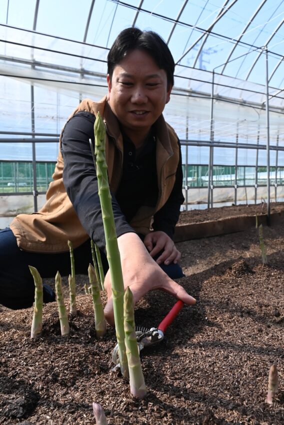 JA管内の各地で、ハウス栽培のアスパラガスの出荷が始まります。県内一の産地、勝英アスパラ部会では、50戸が5.4㌶で栽培。昨年夏の暑さや2月の気温の低さが影響し、例年より5~10日生育が遅れ、3月14日から選果場の稼働を始めました。冬の間に栄養を蓄えて成長する春芽は、甘くて柔らかく、みずみずしく、消費者が待ち望む春の味です。