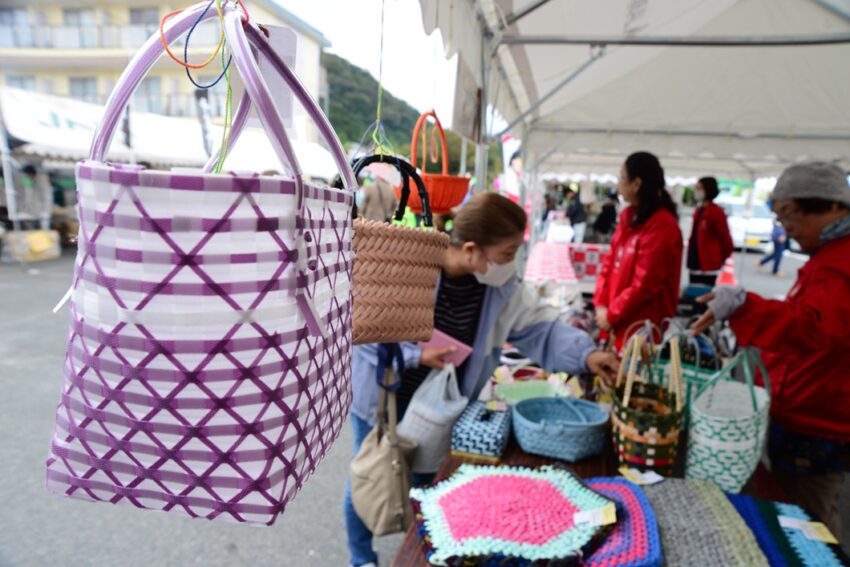 このほか、廃材を再利用して作った手芸品を展示即売。手さげバッグや腕抜き、座布団など、手作りのぬくもりが感じられる作品150点以上が並び、来場者とのやりとりや会話に笑顔が広がりました。三吉孝美部長は「地域みんなに喜んでもらえるのが活動の原点。参加して楽しい組織を内外にアピールしたい」と話します。