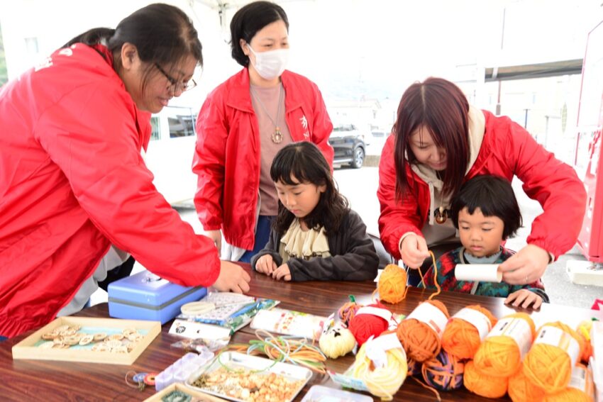フレッシュミズ部会は親子参加型の体験コーナーを設け、子どもたちが雑貨づくりを楽しみました。中田翔子部会長は「次はお菓子づくりをするので親子で気軽に参加して」と呼びかけます。