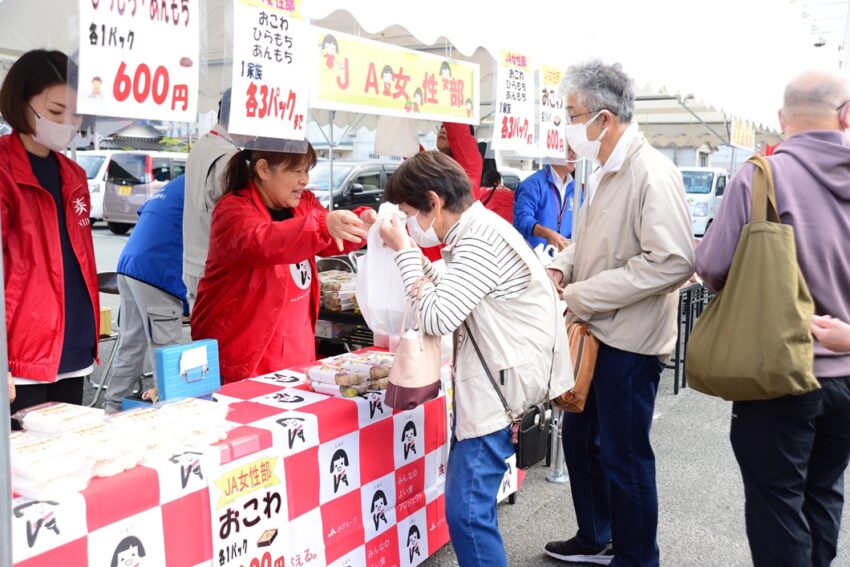 食と農を基軸に協同の輪を広げようと、新見地区の感謝祭にバザーやワークショップを出店しました。組合員や地域住民が毎年楽しみにしていた「JA阿新まつり」を継承し、規模こそ小さくなったものの40年以上続く活動です。JAグループ統一運動の「国消国産」や「みんなのよい食プロジェクト」の一環として、地元産「ヒメノモチ」を使ったおこわや餅を加工販売し、食文化の伝承や地産地消の意義を訴えました。