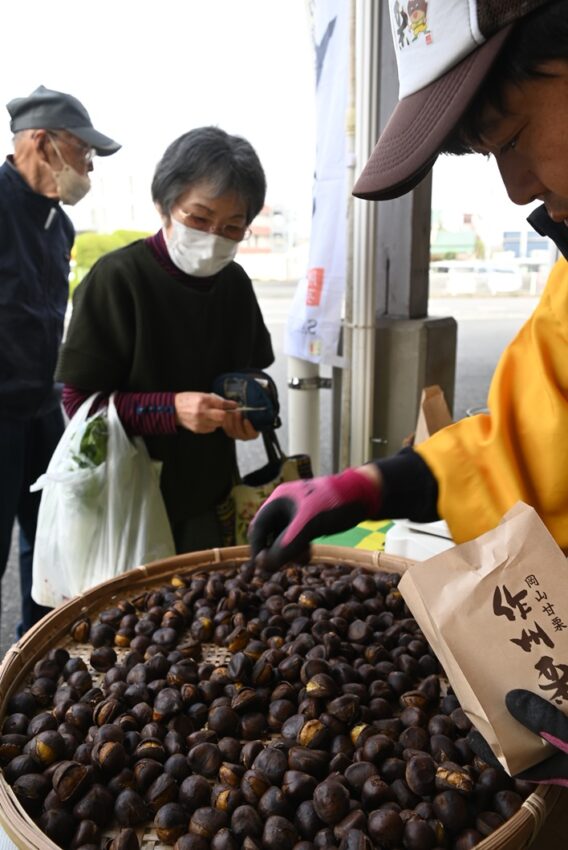 国産甘栗「作州栗」の焼き栗販売が今年も始まりました。11月8日には、真庭市のJA直売所「きらめきの里」のイベントに参加。職員が一つ一つ手作業で切り込みを入れた栗を、専用の機械で圧力をかけて販売しました。 JAは実演販売でファンをつくり、地域一体で生産者と栽培面積を増やす考えです。知名度を上げて市場出荷、生産者の所得増大、耕作放棄地対策にもつなげます。