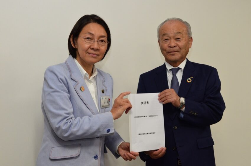 JAでは経営支援や地域資源の活用、スマート農業技術の導入支援などに取り組んでいますが、地域農業の持続的な発展を図るため、農業経営を下支えする施策の充実・強化を求め前年に続き要望書を提出。農家のコスト負担が大きい現状や鳥獣被害対策、耕作地維持の重要性などを説明し、営農意欲につながる支援を訴えました。
