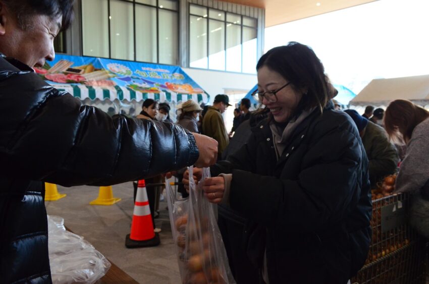 初日は、出荷者らが特製焼きそば・てんぷら・コロッケなどを調理し販売。タマネギ詰め放題や青壮年部による餅つき実演などをしました。2日目はブランド和牛「千屋牛」精肉を一部4割引きで販売しました。