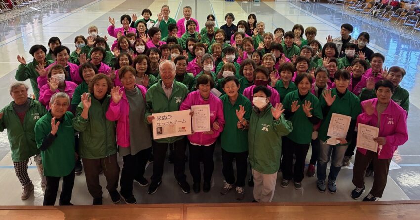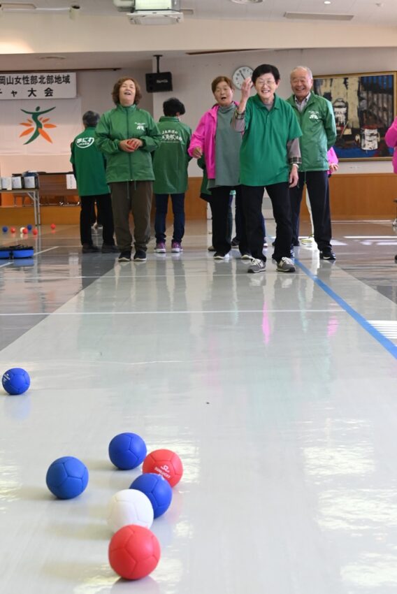 ボッチャは女性部の活動にも広く取り入れられており、初めての人も経験者も一緒になってボールの行方に一喜一憂。抱き合ったりハイタッチするなど、喜びを分かち合いました。内藤敏男組合長をはじめ3地区出身の役員もチームに混じってプレーし、会話を弾ませながら交流を深めました。