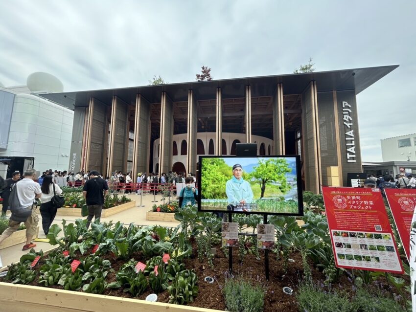 6月上旬、大阪・関西万博のイタリアパビリオン正面に矢掛町産イタリア野菜を展示しました。