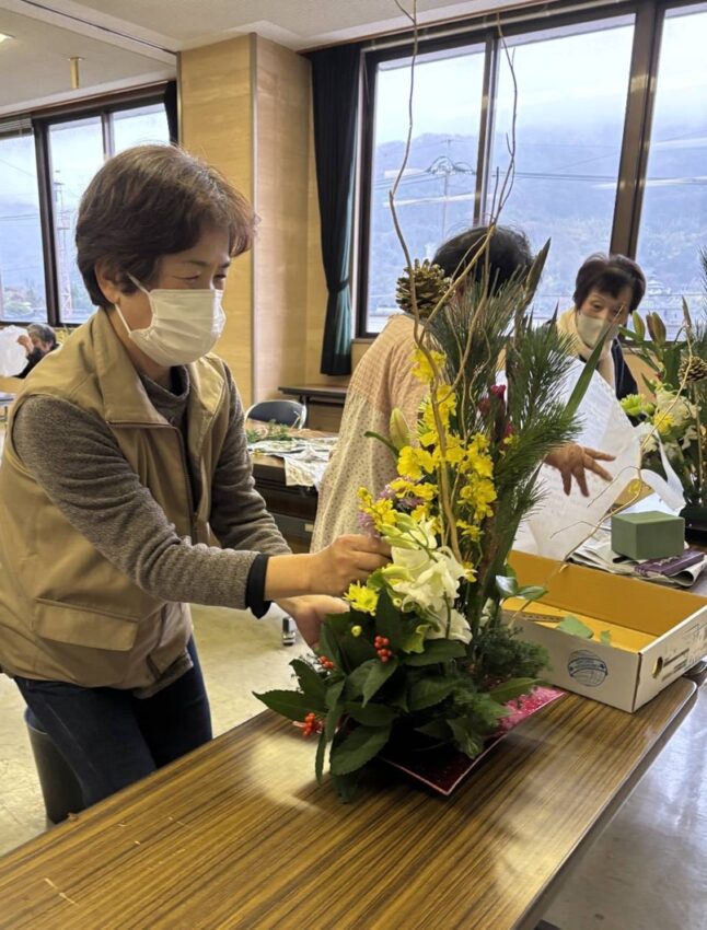 同支部は同月、フラワーアレンジメント教室も行いました。部員12人が参加。協力して準備をし、バランスや色あいを見ながら、作品を仕上げました。