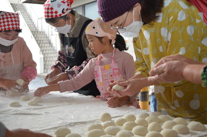 女性部員と一緒にもちを丸める参加者
