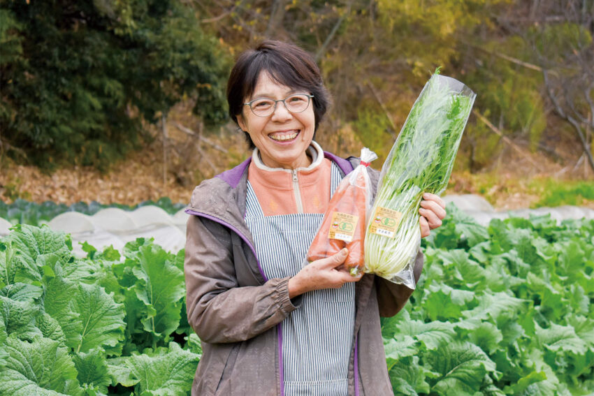 JAに勧められ、2003年に「おかやま有機無農薬農産物」の認証を受けました。農薬や化学肥料を一切使わず、堆肥や油かす・魚かす・かき殻など、有機由来の資材を活用して野菜を育てています。乙島地区有機無農薬野菜生産研究会に所属し、15アールほどの畑で露地野菜を周年栽培。夏はトマト・ピーマン・ナス、冬はナバナ・ホウレンソウ・ニンジンなどです。端境期が出ないようスケジュールを組んでいます。売れるとうれしく、寒い時期でも畑に出る力になります。手間もかかりますが、本当に作りがいがあります。近年は猛暑で、毎日の水やりが欠かせず、管理も大変になりました。それでも、「甘くてやわらかい」「日持ちがする」「いつも買わせてもらってるよ」と声をかけてもらえると、また頑張ろうと思えます。改善を重ね、より安全安心な野菜を届けるのが私の一番のやりがいです。