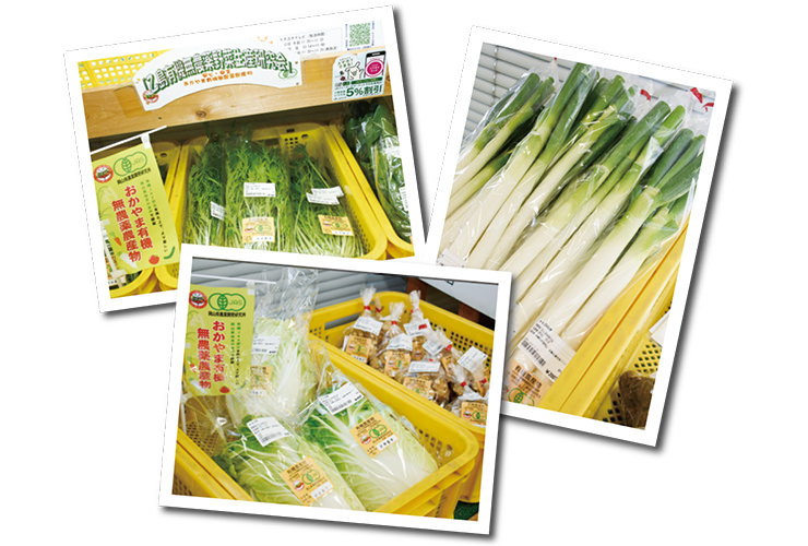 「乙島地区有機無農薬野菜生産研究会」が手掛ける安全安心な「おかやま有機無農薬農産物」のコーナーを設けています。その時々の旬の野菜が並び、今はナバナ・ホウレンソウ・キャベツ・白ネギなどがおすすめです。