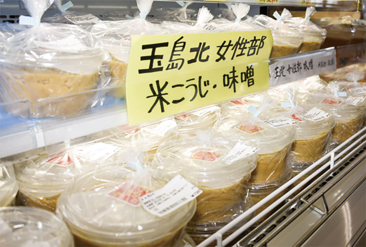 加工品コーナーには玉島北女性部の手作り米こうじ・味噌が並びます。祭り寿司など、年間を通して季節の手料理がぬくもりを感じさせ、多くの方が楽しみに訪れます。