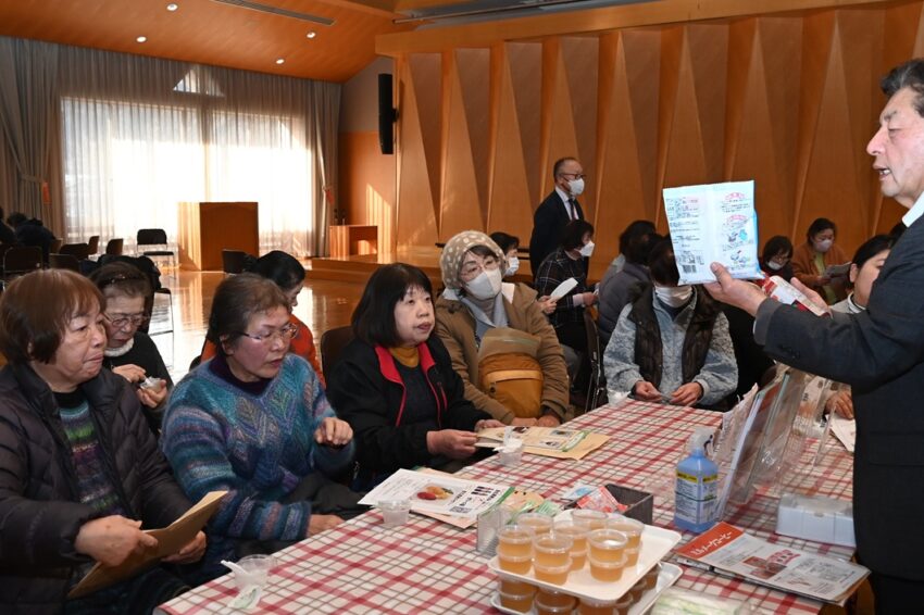 女性部真庭地区は1月中旬、真庭市でJAのプライベートブランド「エーコープマーク品」の商品知識を学ぶ「暮らしの運動」を開きました。