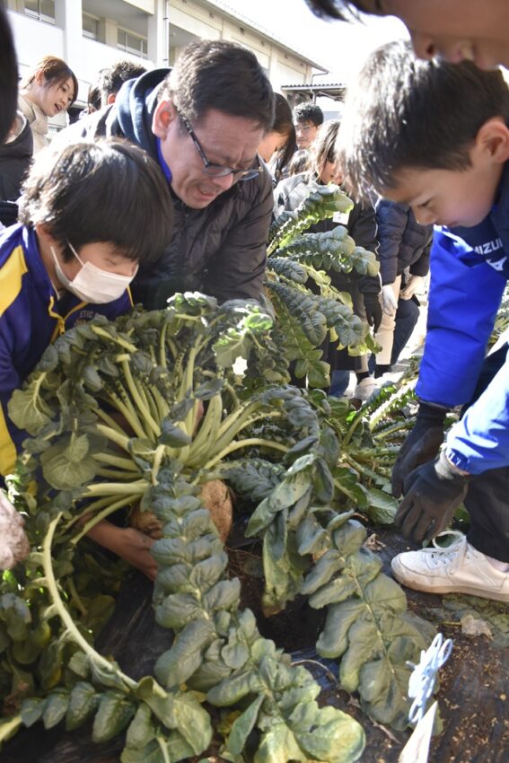 同プロジェクトは昨年9月からスタート。JA西部基幹アグリセンターの営農指導員のもと、当日の収穫まで毎月1回授業を行い、児童が管理してきました。
