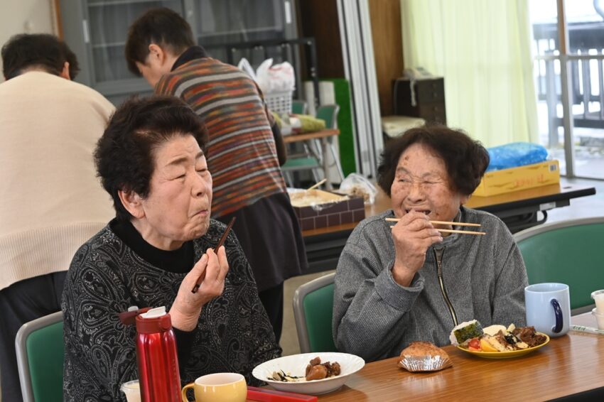 同じワラビでも、塩漬け・乾燥など保存方法の違う2品が並び、冬は雪に閉ざされる蒜山地区で受け継がれてきた、家庭の味を伝えています。参加者は「ここで初めて食べたものもある」「この人の料理はおいしいよ」など作り方や味付けのコツを学び合いながら食事を楽しみました。