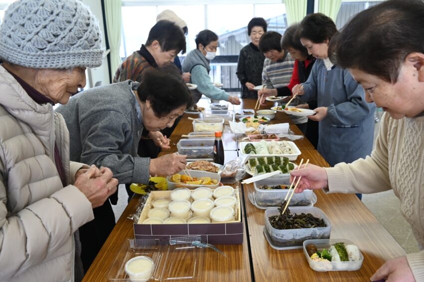 おしゃべりとご馳走の花が咲く、一品持ち寄り会を開きました。出かける機会が減る冬場に集まって交流を深めようと、約10年続いています。料理が苦手な人は果物や菓子を持ち込んでも大丈夫という、気軽に参加できる場が毎年の楽しみになっています。