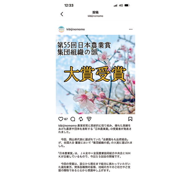 女性や若手の農家らがInstagramを積極的に活用し、「吉備路のモモ」をより身近に感じてもらえるよう情報発信しています。また、オリジナルタオルを作成して市場関係者に配るなど販売促進につなげています。