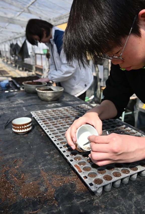 新見基幹アグリセンターは4月7日、新見市で阿新トマト部会が栽培する「桃太郎トマト」の種まきをしました。JA職員ら7人が参加し、トレー32枚分の種をまきました。
